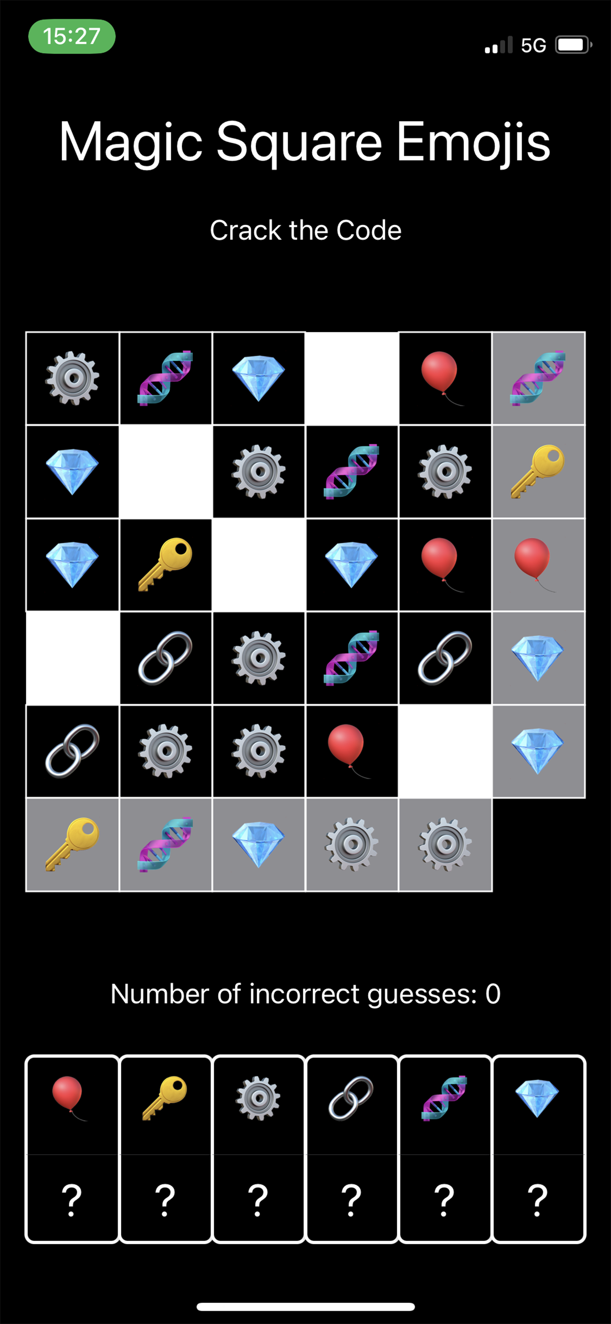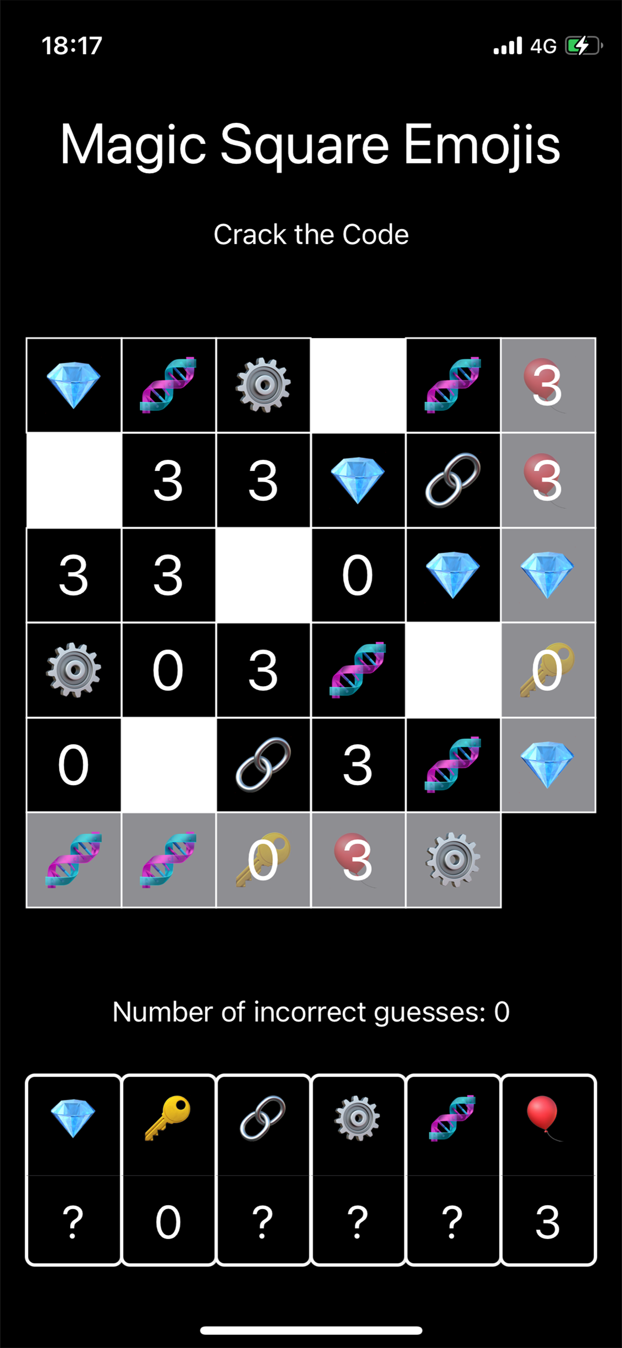 Crack the code by touching on the emojis at the bottom of the screen. The aim is to work out the digit that each emoji represents with as few incorrect guesses as possible. A long press on the screen can be used to start a new game at any time.
